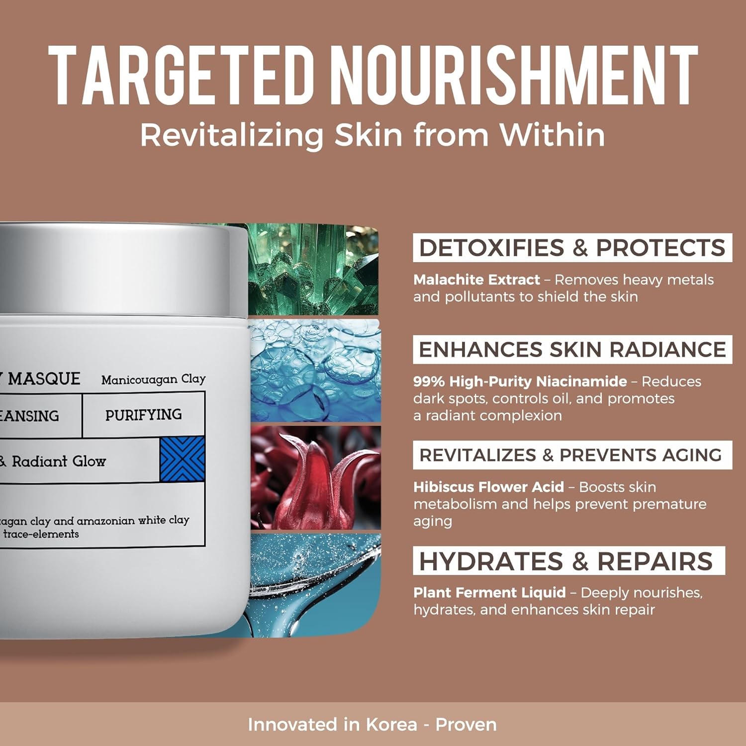 • Deep Cleansing & Pore Purification: Amazon White Clay, Dead Sea Mud, and Canadian Glacial Mud work together to deeply cleanse pores, removing excess oil, dirt, and blackheads. Ideal for oily and acne-prone skin, this mask regulates oil production, prevents clogged pores, and leaves the skin fresh and smooth