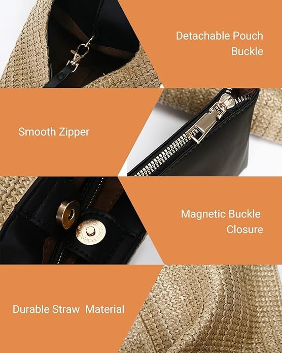 • [Handwoven and Nature Durable Material]: The fashion straw pocketbook bag is made of natural straw weaving materials and vegan faux PU leather, which is trendy and casual. Classic pattern and top magnetic buckle closure that helps keep your items contained. Personalized your summer charming style.